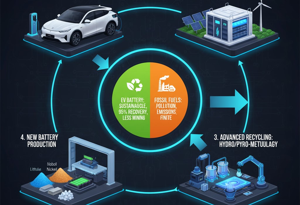 - Quy trình khép kín: Các nhà máy tái chế hiện đại hoạt động theo mô hình kinh tế tuần hoàn. Nước và hóa chất được tái sử dụng, khí thải được lọc trước khi ra môi trường. Mục tiêu cuối cùng là tạo ra một vòng lặp: pin cũ -> nguyên liệu thô -> pin mới.